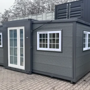 Această căsuță modulară modernă este ideală pentru birouri, spații comerciale temporare sau locuințe de urgență. Construită pe structură metalică solidă, căsuța oferă confort, izolație bună și funcționalitate într-un spațiu compact, dar bine organizat.